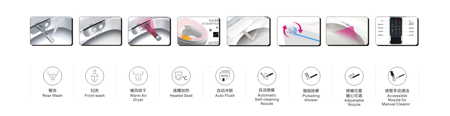 Enter公司堅持不懈的自我完善,倡導產品以人為本、科技為先,服務優(yōu)質高效。以生產研發(fā)高質量的產品為目標,繼續(xù)推動創(chuàng)新與發(fā)展,使產品的系列化、多樣化與結構的多元化,滿足不同客戶的差異化需求。 公司研制的智能馬桶豪潔、舒潔、美潔三大系列產品款式引領衛(wèi)浴時尚潮流,造型多變,設計精美小巧,生動的展現現代藝術精髓,彰顯世上而富有情趣的生活空間是賓館、酒店、寫字樓及家庭裝潢的理想選擇。